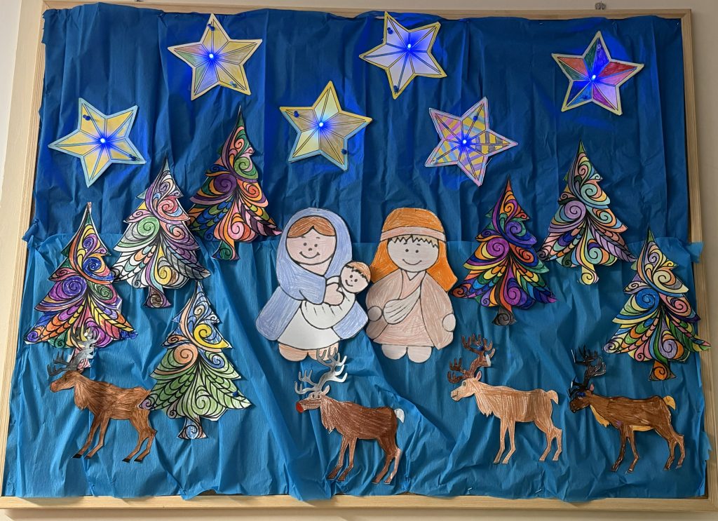 W szkolnym korytarzu zawisła wyjątkowa gazetka świąteczna, przygotowana przez panią Jolę i panią Ewelinę niezastąpione panie z Kindloteki. Tym razem dekoracja przyciąga uwagę nie tylko pięknymi świątecznymi motywami, ale również nowoczesnym akcentem – zostały w niej wykorzystane diody LED, które dodają całości niezwykłego blasku.